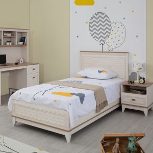 Takım, geleneksel tarzın özünden ilham alırken, modern detaylarla zenginleştirilmiş, gençlerin tarzına hitap eden bir tasarıma sahiptir. - Karyola 120*200 Genişlik: 130 Derinlik: 208 Yükseklik: 108